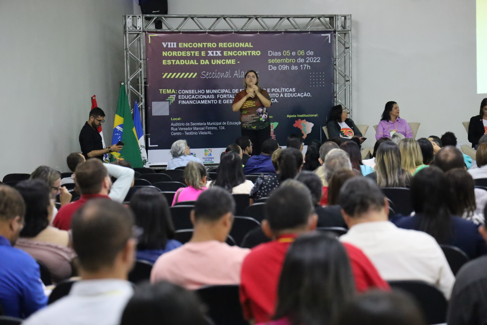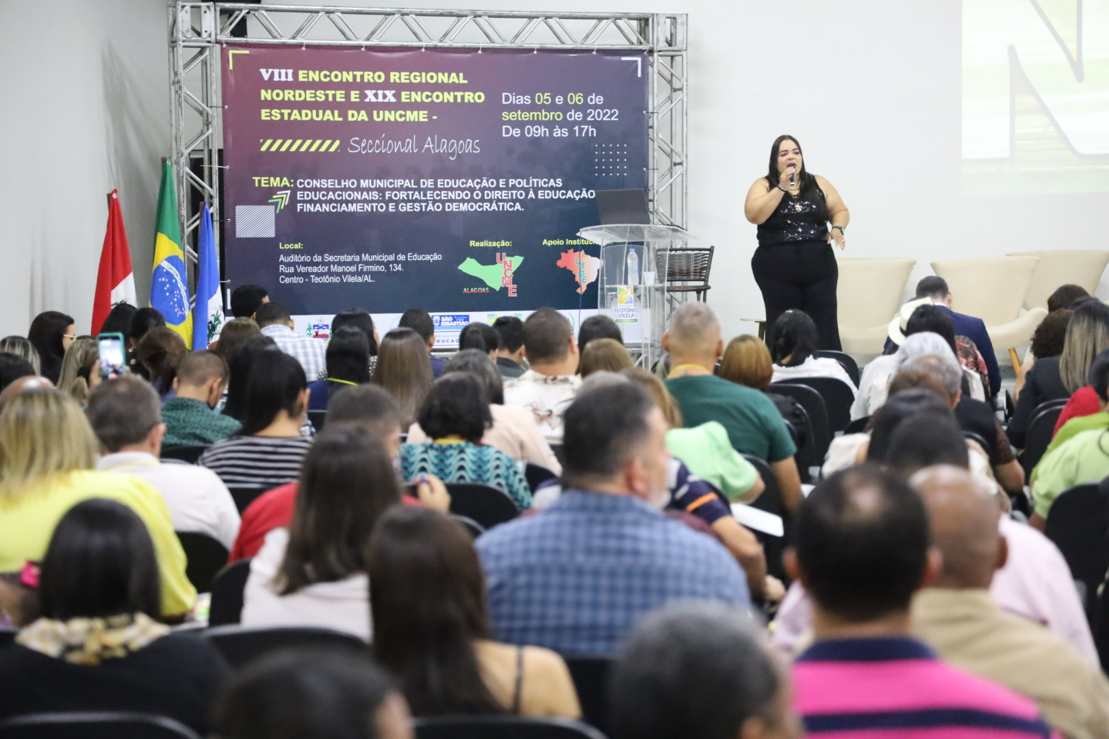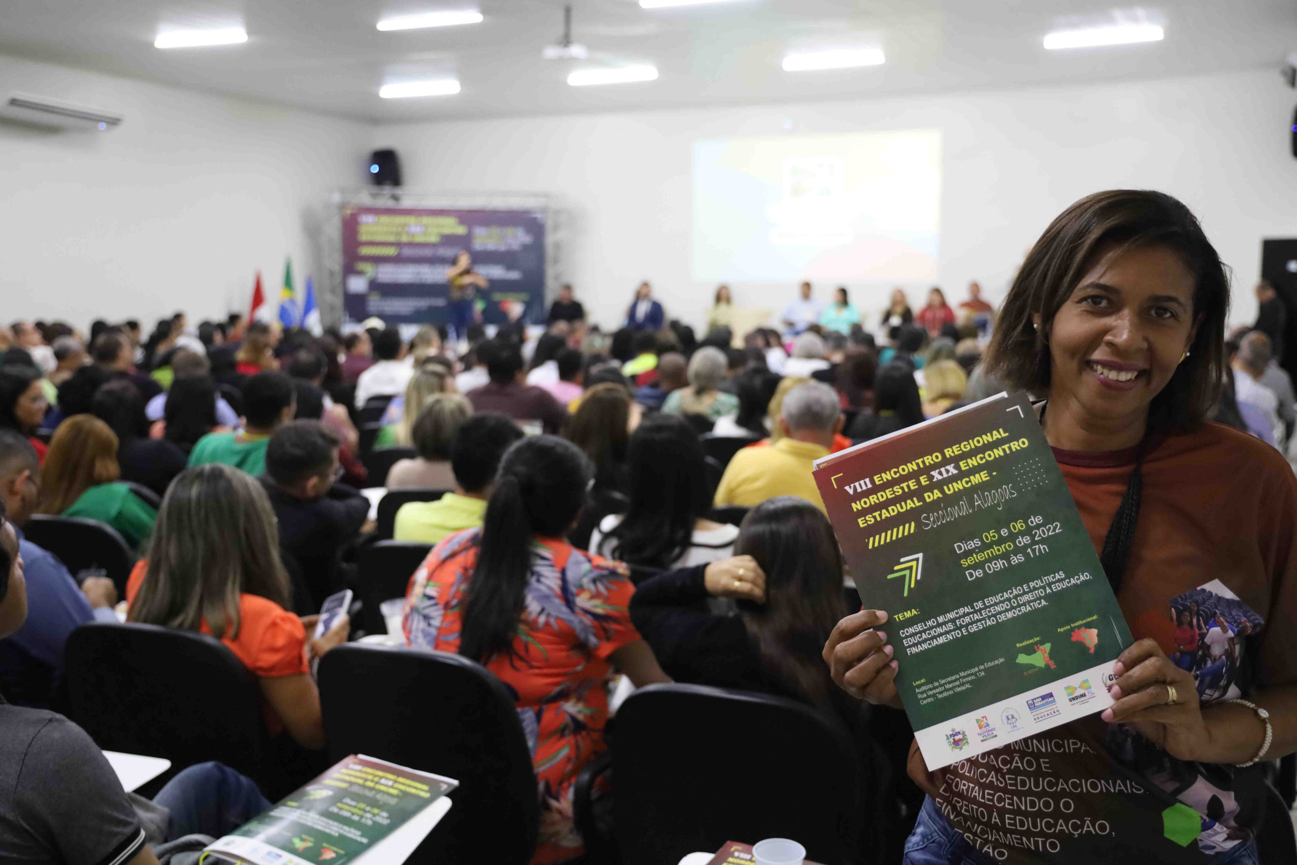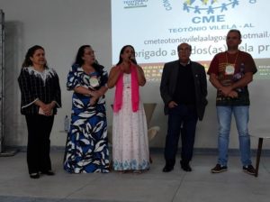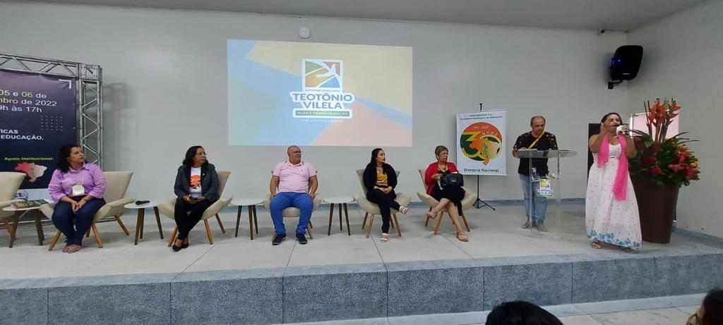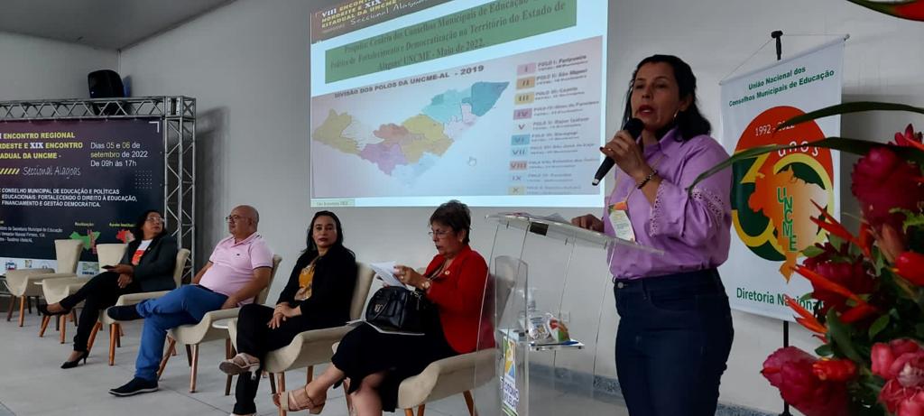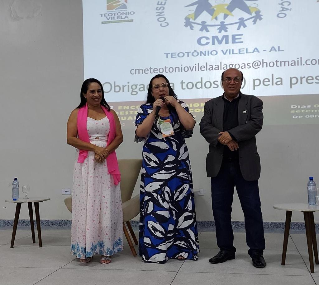 Entre os dias 05 e 06 de setembro ocorreu na cidade de Teotônio Vilela – Alagoas, o VIII Encontro Regional Nordeste e XIX Encontro Estadual da UNCME, com a presença de 450 conselheiros, técnicos e dirigentes municipais de Educação, o evento foi sucesso absoluto, e movimentou todo município. Como o evento também foi regional, estiveram presentes, os Estados da Bahia, Ceará, Paraíba, Pernambuco, Piauí, Rio Grande do Norte e Sergipe. Com o tema: Conselho Municipal de Educação e Políticas Educacionais, fortalecendo o Direito à Educação, Financiamento e Gestão Democrática, coube ao prof. Genuíno Bordignon a palestra sintetizadora do encontro. Ainda, a Primeira Infância, teve destaque acerca do direito, espaços e o brincar, painel comandado por Gilvânia Nascimento – UNCME, Solidade Menezes – RNPI, Ana Cláudia Leite – Instituto Alana, Elizangela Leal – REPI AL e Noêmia Pereira – DME de Teotônio Vilela. As experiências exitosas das seccionais seguiu a seguinte ordem: Eliane Souza – AL, Gilvânia Nascimento – BA, Antonete Gomes – CE, Temístocles Maciel – PB, Vaneska Melo – PE, Maria Antônia (Lilica) – PI, Juselice Alencar (Tuca) – SE, Sirleyde Dias – RN. O Financiamento para Educação coube à Diego Lutz – UFRGS e UNDIME RS. Para profa. Marly Vidinha, vice – presidente Nacional da UNCME para região Nordeste e coordenadora da Seccional Alagoas, o evento dessa magnitude e com procura altíssima de participação, demonstra a necessidade de uma preocupação mais que necessária de atenção aos conselhos da Educação, e de mais parcerias para que , as políticas públicas para Educação sejam prioridade absoluta.