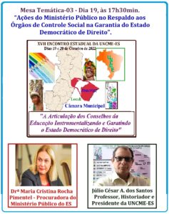Despontando com um elenco de palestrantes-convidados da mais alta qualidade e respeito no meio intelecto-conselheirial, o Encontro da UNCME-ES dignificou os participantes com nomes de destaque no cenário nacional e capixaba, conforme listado no quadro abaixo. Para o Presidente da entidade, o professor, jornalista e historiador, Júlio César Alves dos Santos, ao se pensar na organização do evento, foi lembrado o mote previsto para o Encontro Nacional, versando sobre os princípios democráticos, bem como as pautas inscritas no cotidiano das escolas e Conselhos da Educação, abrangendo os CMEs, CACS FUNDEBs e CAEs.