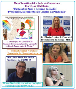 Batendo na tecla do controle social de forma autônoma pelos Conselhos da área de Educação, o XVII Encontro Estadual da União Nacional dos Conselhos Municipais de Educação – UNCME-ES, realizado nos dias 19 e 20 de outubro, no município de Aracruz, situado ao litoral Norte, do Espírito Santo, destacou a temática “A Articulação dos Conselhos da Educação Instrumentalizando e Garantindo o Estado Democrático de Direito”, elegendo como focos de debate os tópicos sobre regime de colaboração, perspectivas da Educação Especial, suporte do Ministério Público aos órgãos de controle social, retorno das aulas presenciais, postura dos CACS FUNDEBs, articulação do SNE, além da participação dos povos originários, quilombolas e povos tradicionais nos Conselhos.