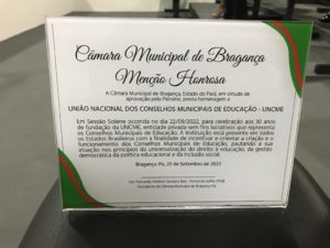 A Sessão em homenagem a entidade foi presidida pelo Presidente da mesa Vereador Fernando Antônio Santana Reis – Fernando Julifer (PSB), e contou com a presença de Vereadores, a Coordenadora Estadual da Uncme Pará, Profa. Nazaré Reis, a Secretária Executiva, Profa. Clara Yunes, o Secretário de Educação de Bragança, bem como presidentes e equipe dos Conselhos Municipais de Educação de Ananindeua, Belém, Bragança, Castanhal, Capanema, Ourém e Salinópolis.