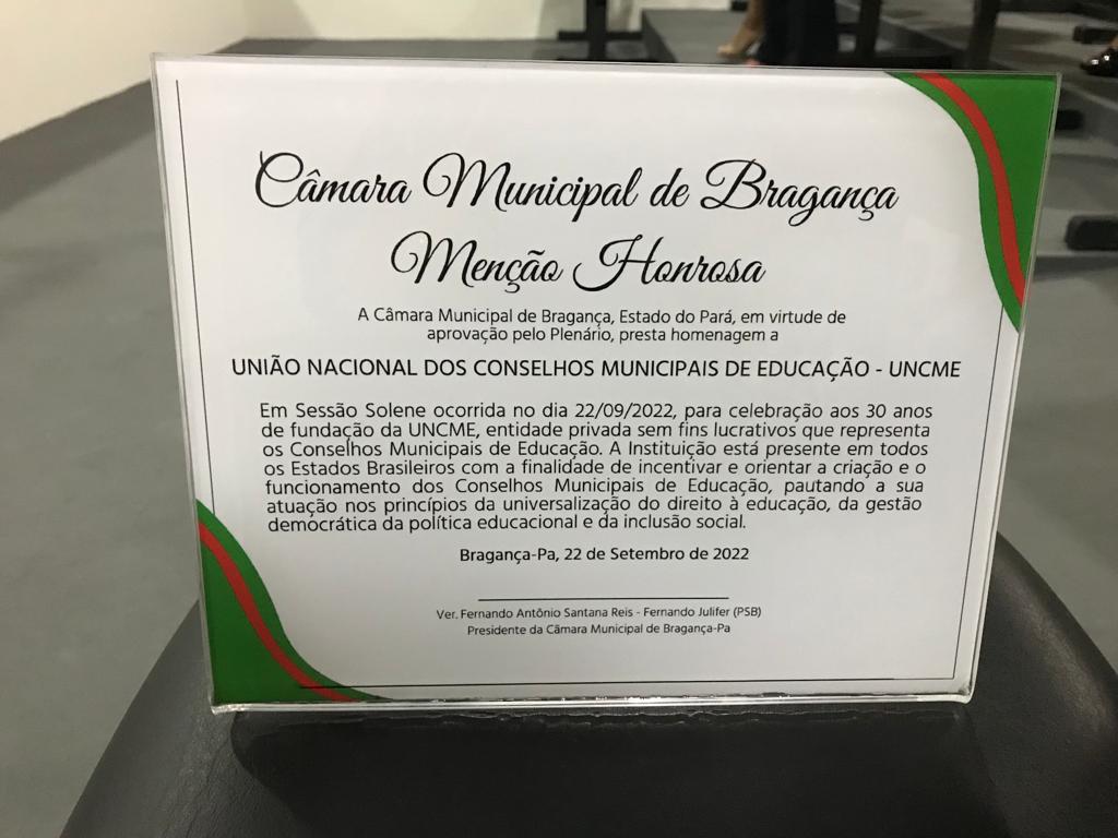 A Sessão em homenagem a entidade foi presidida pelo Presidente da mesa Vereador Fernando Antônio Santana Reis – Fernando Julifer (PSB), e contou com a presença de Vereadores, a Coordenadora Estadual da Uncme Pará, Profa. Nazaré Reis, a Secretária Executiva, Profa. Clara Yunes, o Secretário de Educação de Bragança, bem como presidentes e equipe dos Conselhos Municipais de Educação de Ananindeua, Belém, Bragança, Castanhal, Capanema, Ourém e Salinópolis.