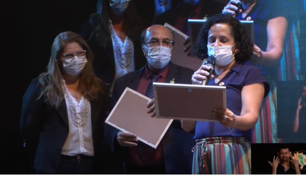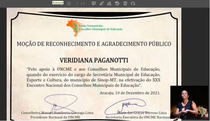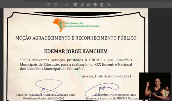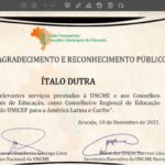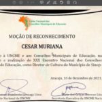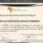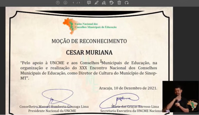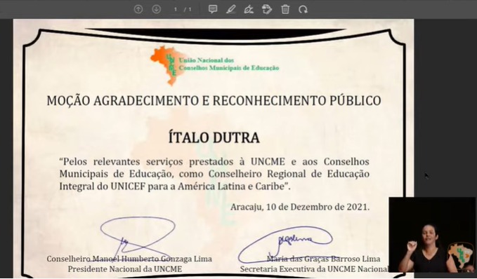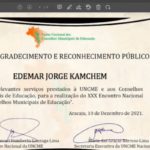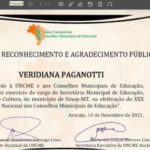 Também foi realizado a entrega de Moção de Reconhecimento Público aos colegas e amigos da UNCME Sr. Ítalo Dutra – Conselheiro Regional de Educação Integral do UNICEF para América Latina e Caribe e para o saudoso Sr. Hudson César Veiga Feitosa – in memorian.
