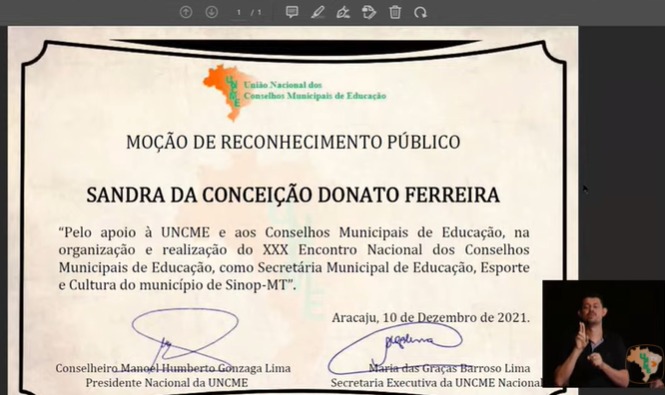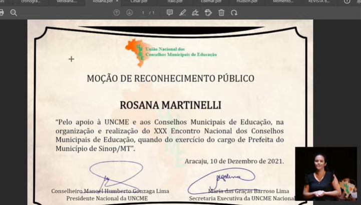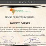 Também foi realizado a entrega de moções de Reconhecimento Público a pessoas que foram importantes para a realização do XXX Encontro Nacional dos Conselhos Municipais de Educação: Sr. Roberto Dorner – Prefeito do Município de Sinop/MT; Sra. Sandra da Conceição Donato Ferreira – Secretária Municipal de Educação, Esporte e Cultura do Município de Sinop/MT; Sra. Rosana Martinelli – Ex Prefeita do Município de Sinop/MT; Sra. Veridiana Paganotti – Ex Secretária Municipal de Educação, Esporte e Cultura do Município de Sinop/MT e Sr. Cesar Muriana – Diretor de Cultura do Município de Sinop/MT.