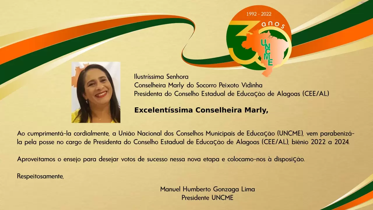 Marly Vidinha que é Vice-presidente da UNCME/Região Nordeste, Coordenadora Estadual da UNCME/AL e presidente do Conselho Municipal de Messias/AL, para ela o diálogo com todas as instâncias é imprescindível “Acreditamos nas parcerias, pois precisamos construir um trabalho fundado em uma concepção de ajuda mútua, tendo como estímulo a escuta como instrumento decisório, a luta incessante por condições dignas de trabalho e valorização de todos que compõe o colegiado”.
