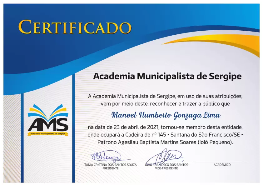 No último dia 23 de Abril, as 19:30h, o presidente Nacional da UNCME, professor Manoel Humberto Gonzaga Lima foi empossado como acadêmico, na cadeira de n° 145, da Academia Municipalista de Sergipe. A academia congrega representantes da Educação, Cultura e Artes de todos os municípios sergipano. Ao professor Humberto nossos parabéns em nome de toda UNCME.