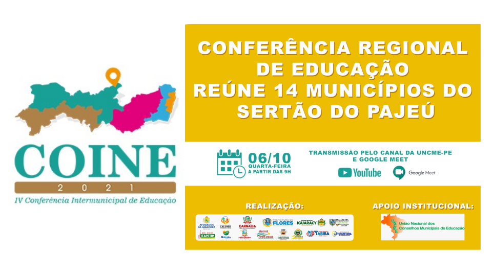 No último dia 06/10/2021 aconteceu a 4ª Conferência Intermunicipal de Educação do Sertão do Pajeú/PE– COINE, reunindo 14 municípios da região. Carnaíba e Afogados da Ingazeira estavam na organização do evento que congregou também Calumbi, Flores, Iguaracy, Ingazeira, Itapetim, Quixaba, Santa Terezinha, São José do Egito, Serra Talhada, Solidão, Tabira e Tuparetama.