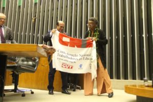 A representante da CNTE, destacou em sua fala a importância dos colegiados da educação, além do oferecimento de uma educação de qualidade que chegue a todas as crianças e estudantes do Brasil.