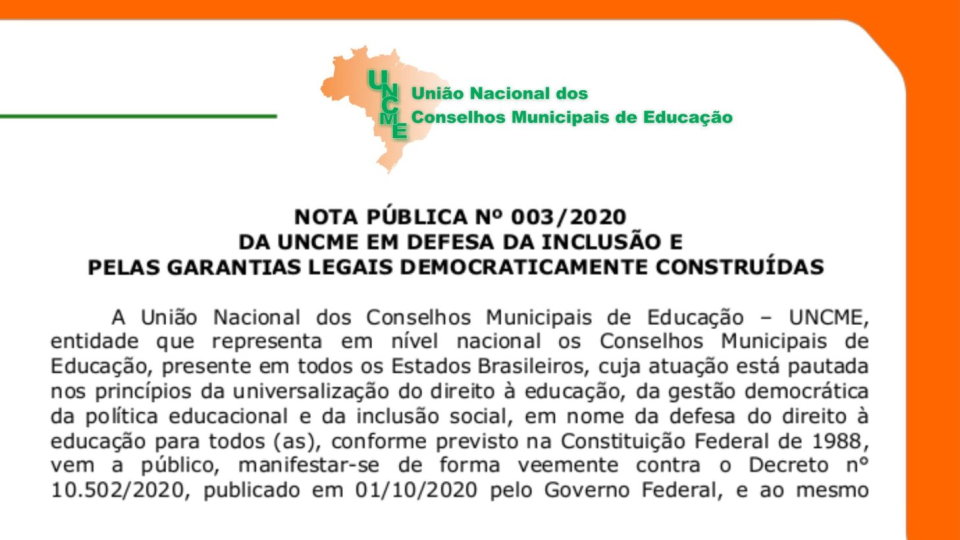 A União Nacional dos Conselhos Municipais de Educação – UNCME, entidade que representa em nível nacional os Conselhos Municipais de Educação, presente em todos os Estados Brasileiros, cuja atuação está pautada nos princípios da universalização do direito à educação, da gestão democrática da política educacional e da inclusão social, em nome da defesa do direito à educação para todos (as), conforme previsto na Constituição Federal de 1988, vem a público, manifestar-se de forma veemente contra o Decreto n° 10.502/2020, publicado em 01/10/2020 pelo Governo Federal, e ao mesmo tempo, orientar os Conselhos Municipais de Educação do Brasil, que como órgãos de Estado, devem estar atentos e atuantes na defesa de que todas as crianças, adolescentes e adultos tenham o direito de conviver em sociedade em igualdade de condições, considerando que o papel fundamental da escola é incluir e contribuir com formação dos cidadãos para que compreendam as diferenças e respeitem as singularidades humanas.