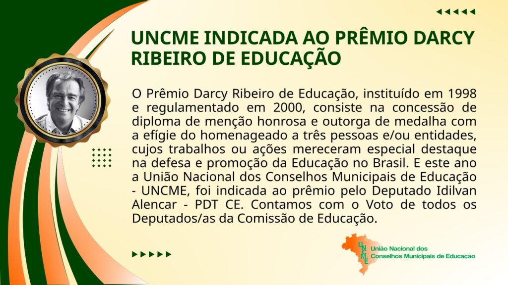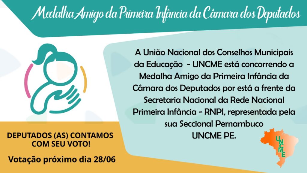 A UNCME foi indicada a duas premiações importantes na Câmara dos Deputados, a primeira indicação foi ao Prêmio Medalha Amigo da Primeira Infância (pelo Deputado federal Mendonça Filho – DEM/PE), a segunda indicação foi ao prêmio Darcy Ribeiro de Educação ( pelo Deputado federal Idilvan Alencar – PDT/CE), ambas indicações demonstram a importância da UNCME no cenário da Educação Nacional. A primeira indicação deve – se a entidade está a frente da Secretaria Executiva da Rede Nacional Primeira Infância – RNPI, e a segunda indicação por toda relevância da entidade junto aos Sistemas municipais de Ensino, principalmente durante a pandemia da COVID 19. Desde já a União Nacional dos Conselhos Municipais da Educação se sente honrada pela indicação de ambos os Deputados, e espera ser agraciada com a premiação em ambos. Parabéns ao demais indicados e contamos com os votos de todos (as) Deputados federais da Comissão de Educação da Câmara Federal.