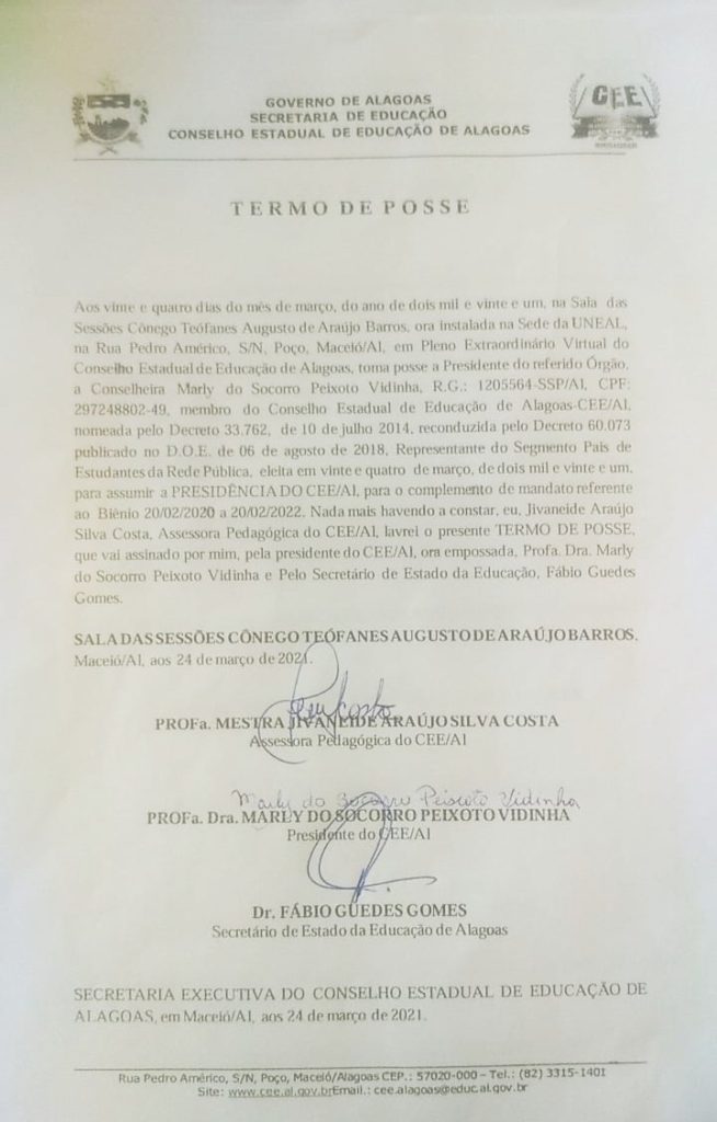 No último dia 24 de março, a VICE PRESIDENTE DA UNCME NACIONAL Região Nordeste, professora doutora Marly do Socorro Peixoto Vidinha foi empossada por Unanimidade PRESIDENTE DO CONSELHO ESTADUAL DE ALAGOAS. Sem dúvidas um momento histórico para UNCME. A professora VIDINHA como é conhecida em sua terra, é coordenadora estadual da UNCME AL e Conselheira de Educação do Município de Messias – AL.