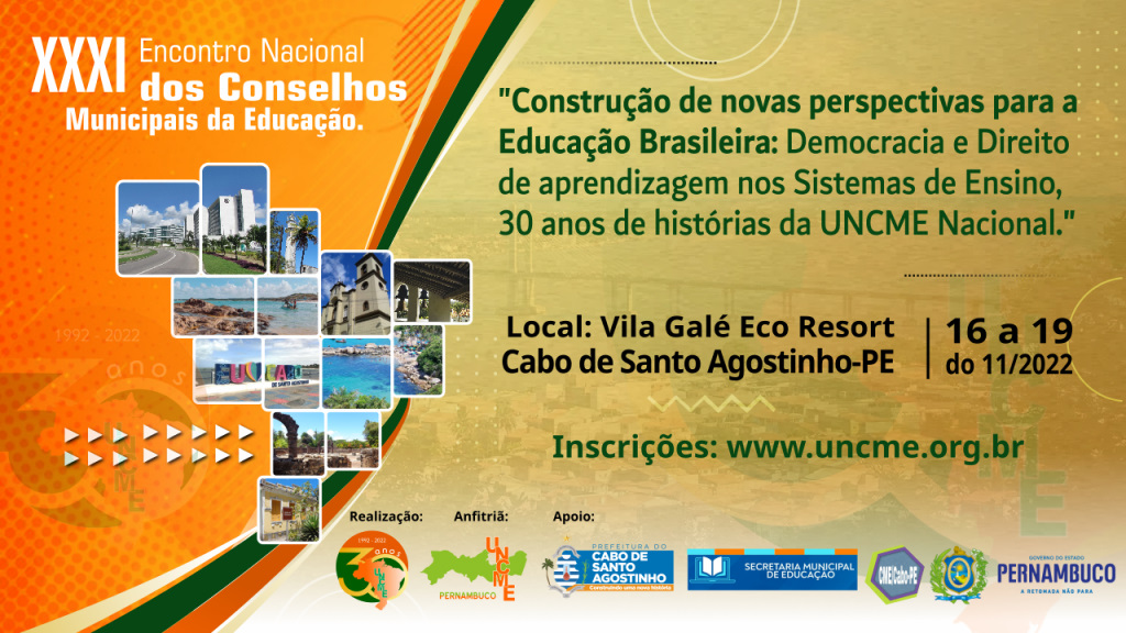 Tem início às inscrições para o XXXI Encontro Nacional dos Conselhos Municipais da Educação – 30 anos de UNCME. O evento ocorrerá de 16 a 19 de novembro de 2022, no hotel Vila Galé Cabo de Santo Agostinho PE. Com o Tema, Construção de novas perspectivas para Educação Brasileira: Democracia e Direitos de Aprendizagens nos Sistemas de Educação. 30 anos de histórias da UNCME Nacional. O evento retorna as suas origens, pois no Cabo de Santo Agostinho ocorreu o primeiro grande Encontro, logo após a Fundação da Entidade. Sem dúvidas será um Encontro marcante para os Conselhos da Educação de todo Brasil. Todos estão convidados. Maiores informações no site do evento uncme.org.br, link das inscrições.