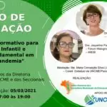 - Percurso formativo para a educação infantil e ensino fundamental em época de pandemiaPúblico-alvo: membros da Diretoria Nacional da UNCME e das seccionaisData: 05/03/2021Horário: das 17h às 19h