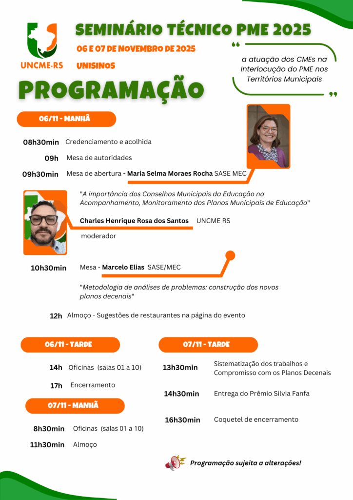 A União Nacional dos Conselhos Municipais de Educação seccional Rio Grande do Sul com o objetivo de promover a capacitação e o fortalecimento dos Conselheiros Municipais de Educação (CMEs) na interlocução e implementação dos Planos Municipais de Educação (PME), realizará o Seminário Técnico com o tema “a atuação dos CMEs na Interlocução do PME nos Territórios Municipais.”